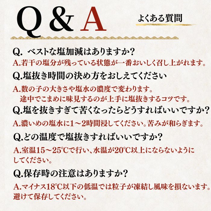 数の子は、独特の風味と食感から、正月やお祝いの席に最適な一品です。 本製品は酢の物、和え物、またはそのままお召し上がりいただくなど、様々な料理への応用が可能です。 塩数の子は、しっかりとした味わいがあり、そのままでも満足のいく味わいをお楽しみいただけます。